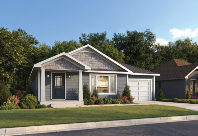 The front entry from the verandah leads to a formal living room and an open country kitchen. The exterior of this home can have simple, clean lines or be customized with vinyl siding and brick in a range of colours and textures.